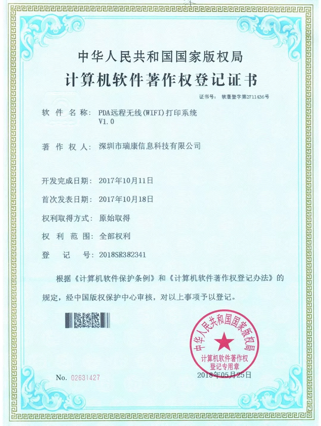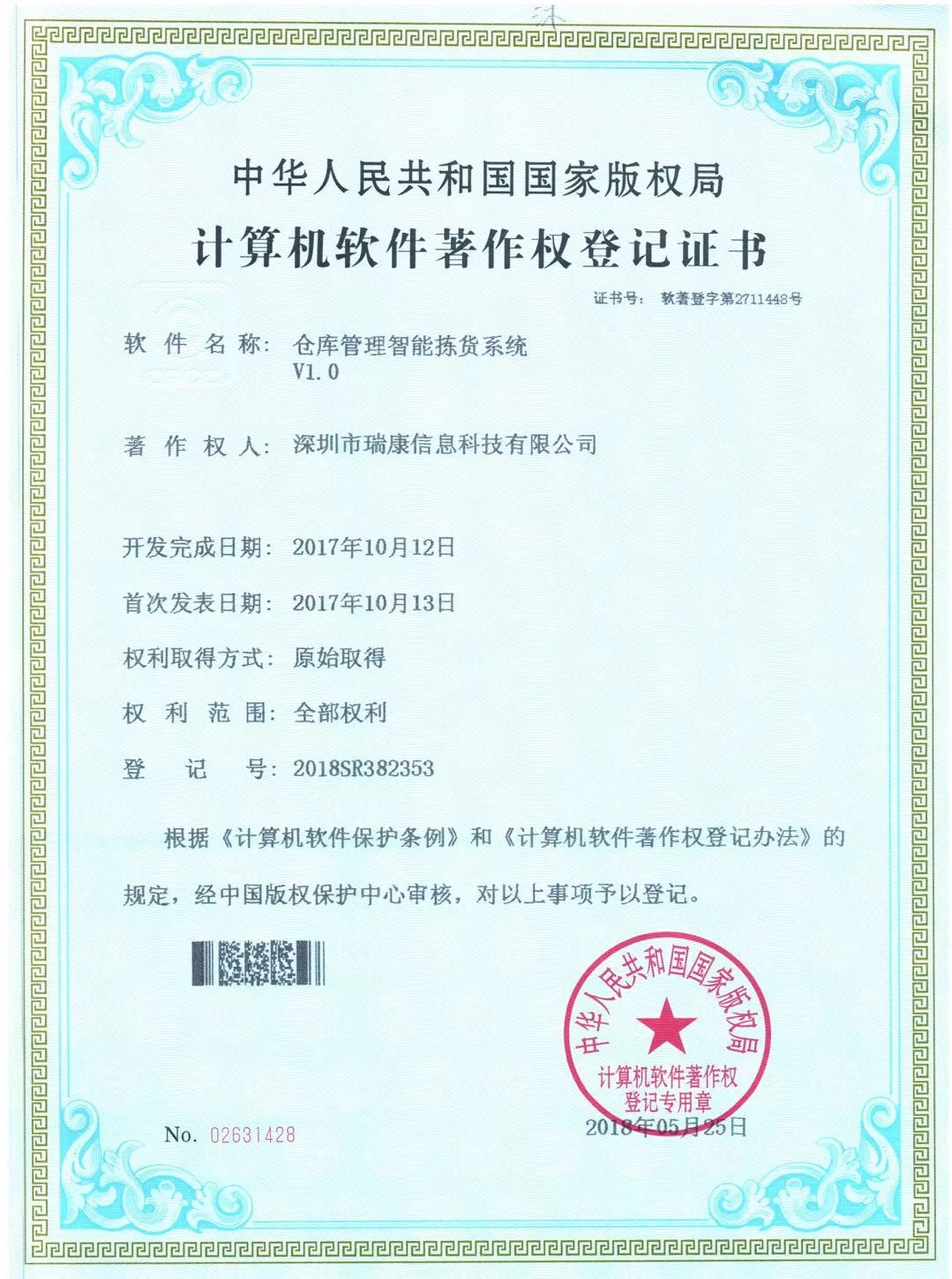近日,瑞康信息科技自主研發(fā)的“倉庫管理智能揀貨系統(tǒng)”、“PDA遠(yuǎn)程無線(WIFI)打印系統(tǒng)”獲得由國家版權(quán)局頒發(fā)的計(jì)算機(jī)軟件著作權(quán)登記證書,這是繼17年獲得7項(xiàng)證書之后,我司在技術(shù)創(chuàng)新領(lǐng)域的又一重大突破。