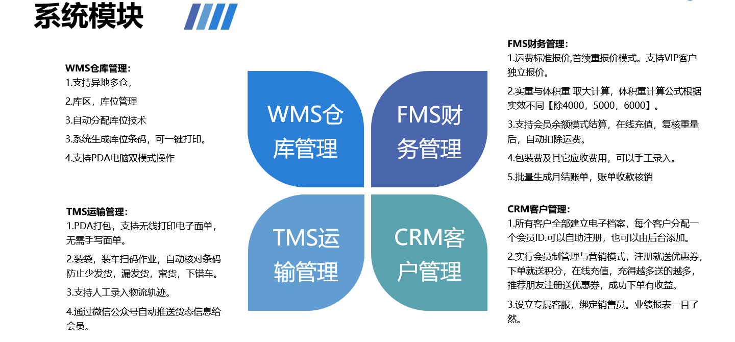 適用于國際專線物流、空運物流、海運、陸運拼、拼箱拼柜、FBA等業務模式。對接微信公眾號。物流軌跡主動推送給客戶 。一鍵批量生成月結賬單,財務收款審核更輕松。